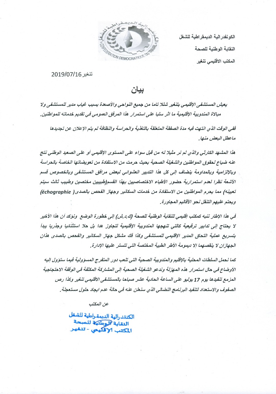 نظمت الكونفدرالية الديموقراطية للشغل وقفة احتجاجية بمستشفى تنغير الإقليمي اليوم الأربعاء 17 بوليود 2019 و جاء ذاك حسب تصريح “محمد العثماني ” الكاتب الإقليمي للنقابة المذكورة قطاع الصحة ، بسبب توقف خدمات النظافة و خدمات المطبخ و خدمات الحراسة بالمستشفى بسبب غياب مدير معين للمستشفى و عدم اكتراث الوزارة المعنية و السلطات الإقليمية للوضع الكارثي للمستشفى.