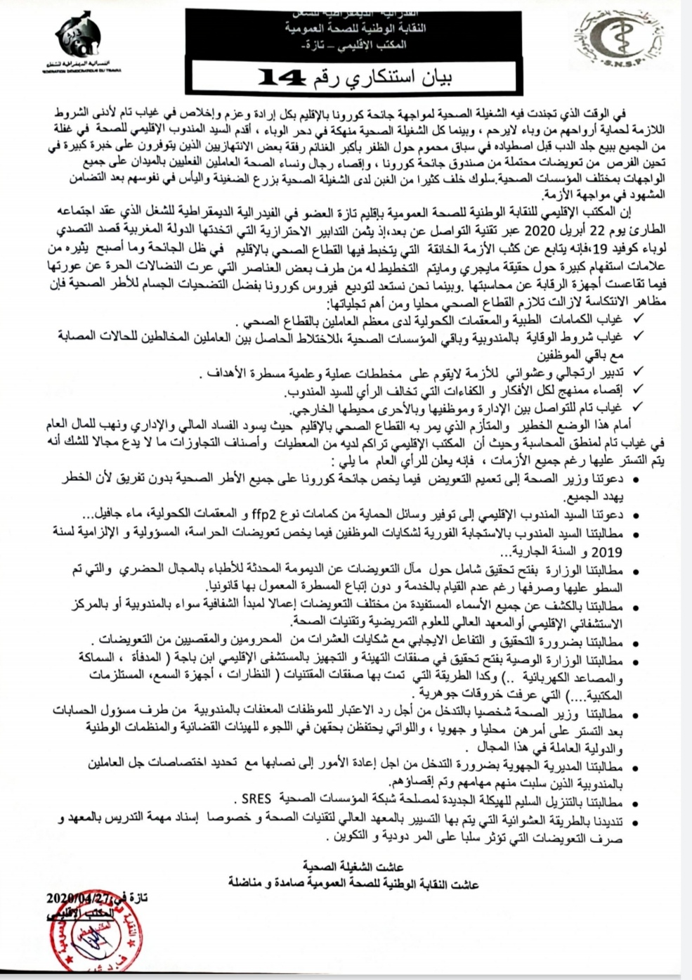 - دعوتنا وزير الصحة إلى تعميم التعويض فيما يخص جائحة كورونا على جميع الأطر الصحية بدون تفريق لأن الخطر يهدد الجميع.