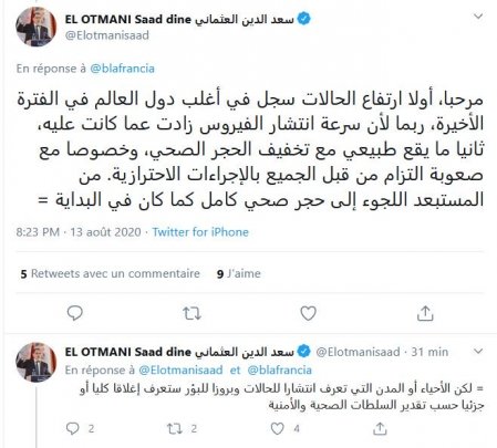 وأضاف رئيس الحكومة في تغريدة له على صفحته بموقع “تويتر” أن هذا الارتفاع “طبيعي مع تخفيف الحجر الصحي، وخصوصا مع صعوبة التزام من قبل الجميع بالإجراء ات الاحترازية”، مستبعدا اللجوء إلى حجر صحي كامل كما كان في البداية.