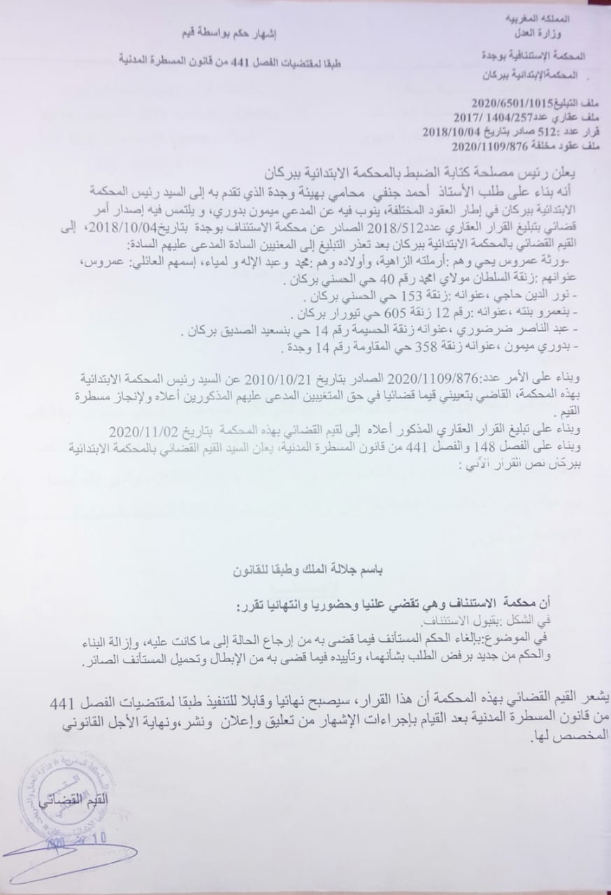 أنه بناء على طلب الأستاذ أحمد حنفي محامي بهينة وجدة الذي تقدم به إلى السيد رئيس المحكمة الابتدائية بيركان في إطار العقود المختلفة ، ينوب فيه عن المدعي ميمون بدوري ، و يلتمس فيه إصدار امر قضائي بتبليغ القرار العقاري عدد 512 /2018 الصادر عن محكمة الاستئناف بوجدة بتاريخ 04 /10/2018، إلى القيم القضائي بالمحكمة الابتدائية ببركان بعد تعذر التبليغ إلى المعنيين السادة المدعى عليهم السادة: