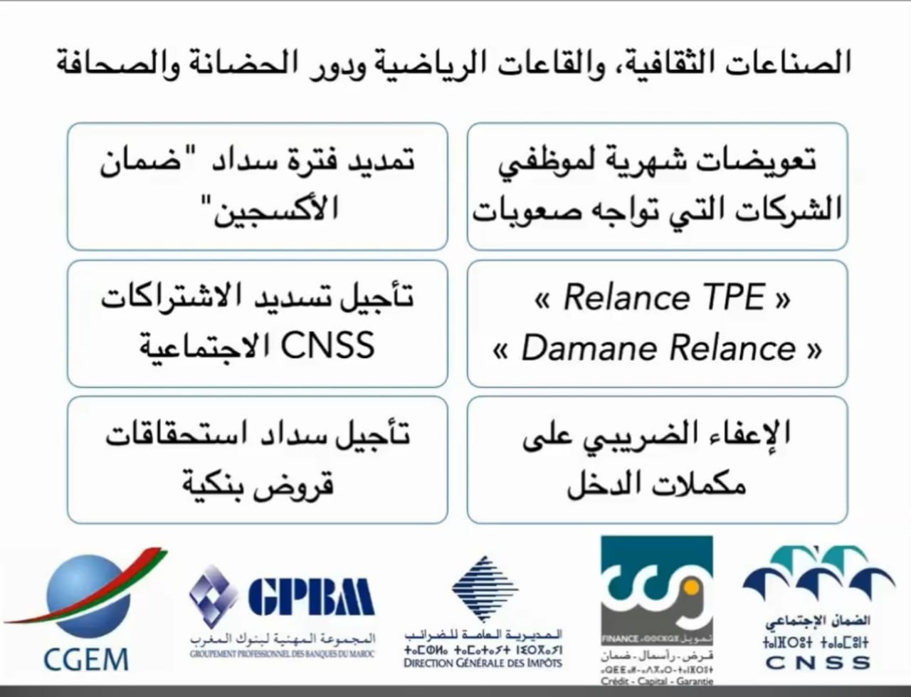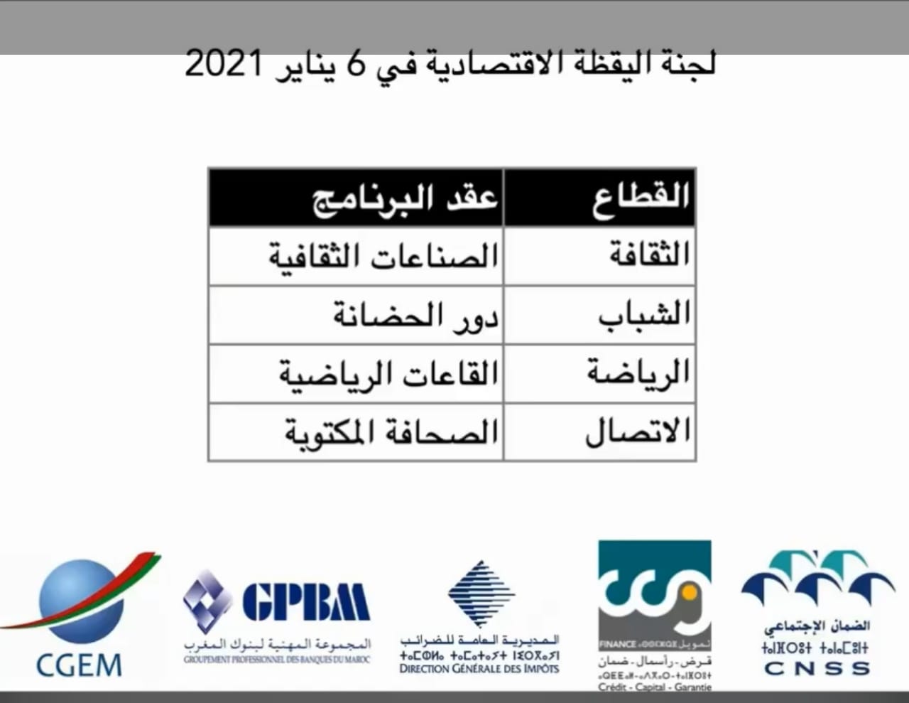 وقد تم التصديق على أربعة عقود برامج من طرف لجنة اليقظة الاقتصادية ، لفائدة الصناعات الثقافية والإبداعية وقاعات الرياضة الخاصة ودور الحضانة والصحافة المكتوبة، وذلك في إطار دعم المهنيين والمساهمة في التخفيف من معاناة خزينة المقاولات، سيستفيد أجراء هذه القطاعات الأربعة المُصرح بهم لدى الصندوق الوطني للضمان الاجتماعي والمتوقفين مؤقتا عن العمل من تعويض مالي، كما سيتم التخفيف من معاناة خزينة المقاولات عبر عدة آليات تتمثل في الإعفاء وتأجيل الأداء وتمديد الآجال وتأجيل سداد الديون البنكية.
