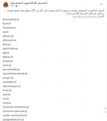 ووفق ما كشفته صفحة “الجيش الإلكتروني الصحراوي” على “فيسبوك”، فإن الهاكرز المغاربة اخترقوا أزيد من 280 موقع جزائري، منها موقع الوكالة الوطنية للتشغيل، والمجلس الشعبي البلدي، ومواقع وزارة الطاقة، والصندوق الوطني للتأمينات الاجتماعية لعمال والأجراء، وموقع الصندوق الوطني للتقاعد.