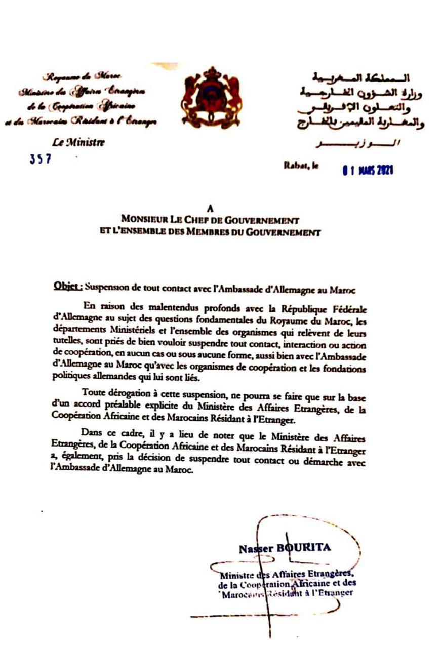 ودعا بوريطة، في المراسلة، القطاعات الحكومية الوزارية المغربية إلى وقف أي اتصال أو تعاون مع السفارة الألمانية وكذلك منظمات التعاون والمؤسسات السياسية الألمانية التي لها علاقة.