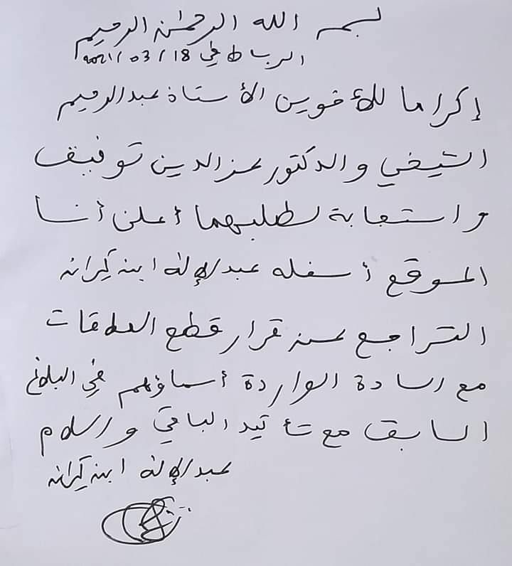 قرر عبد الإلاه ابن كيران رئيس الحكومة والأمين العام السابق لحزب المصباح، مساء اليوم عن تراجعه عن قرار قطع علاقاته مع سعد الدين العثماني وباقي الوزراء البيجيديين الذين تم ذكر أسمائهم في البلاغ السابق.