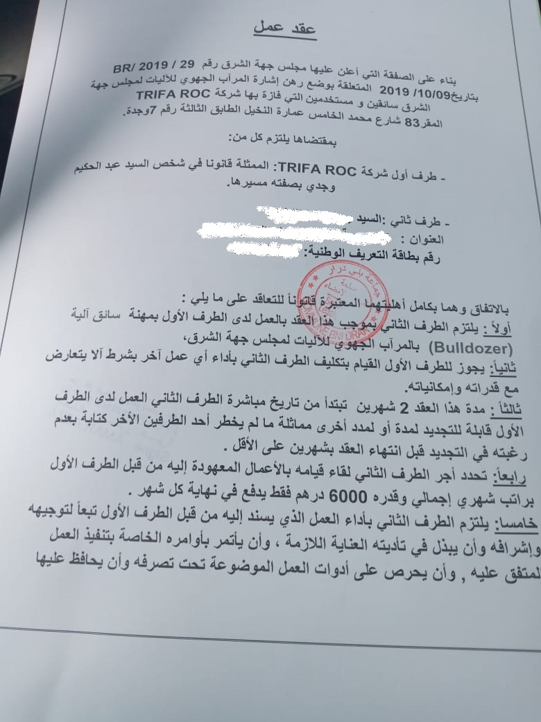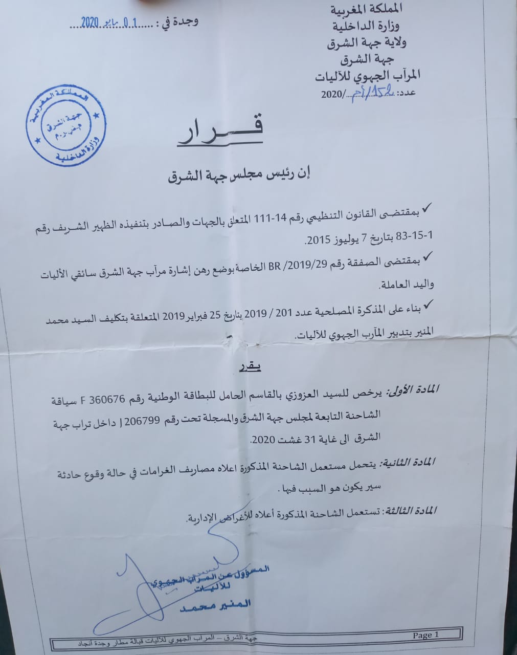 هذا ويتوفر موقعنا على نسخة من قرار مجلس جهة الشرق القاضي بالترخيص للأشخاص الذين تم توقيفهم الإشتغال بالمرآب سابقا، كما توصلنا بنسخة من عقد عمل المستخذمين والشركة السالفة الذكر حول شروط الشغل.