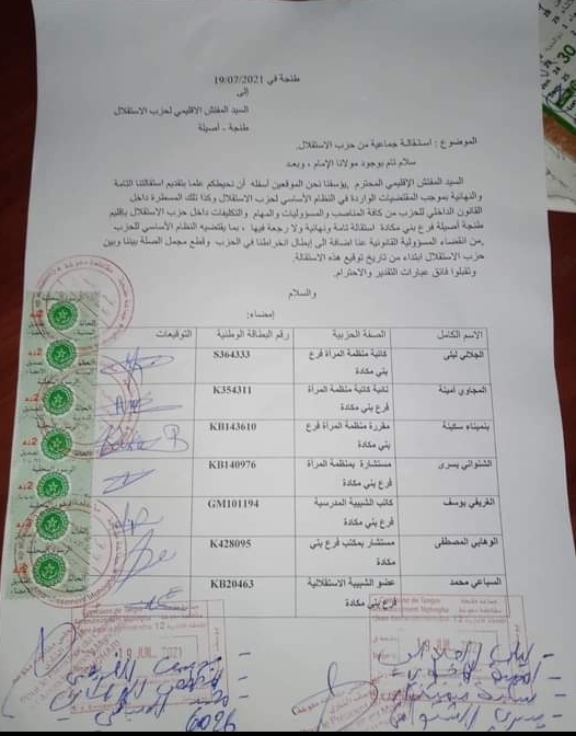 قدم سبعة اشخاص من حزب الاستقلال بعمالة طنجة أصيلة استقالة جماعية ،اليوم 19يوليوز 2021.