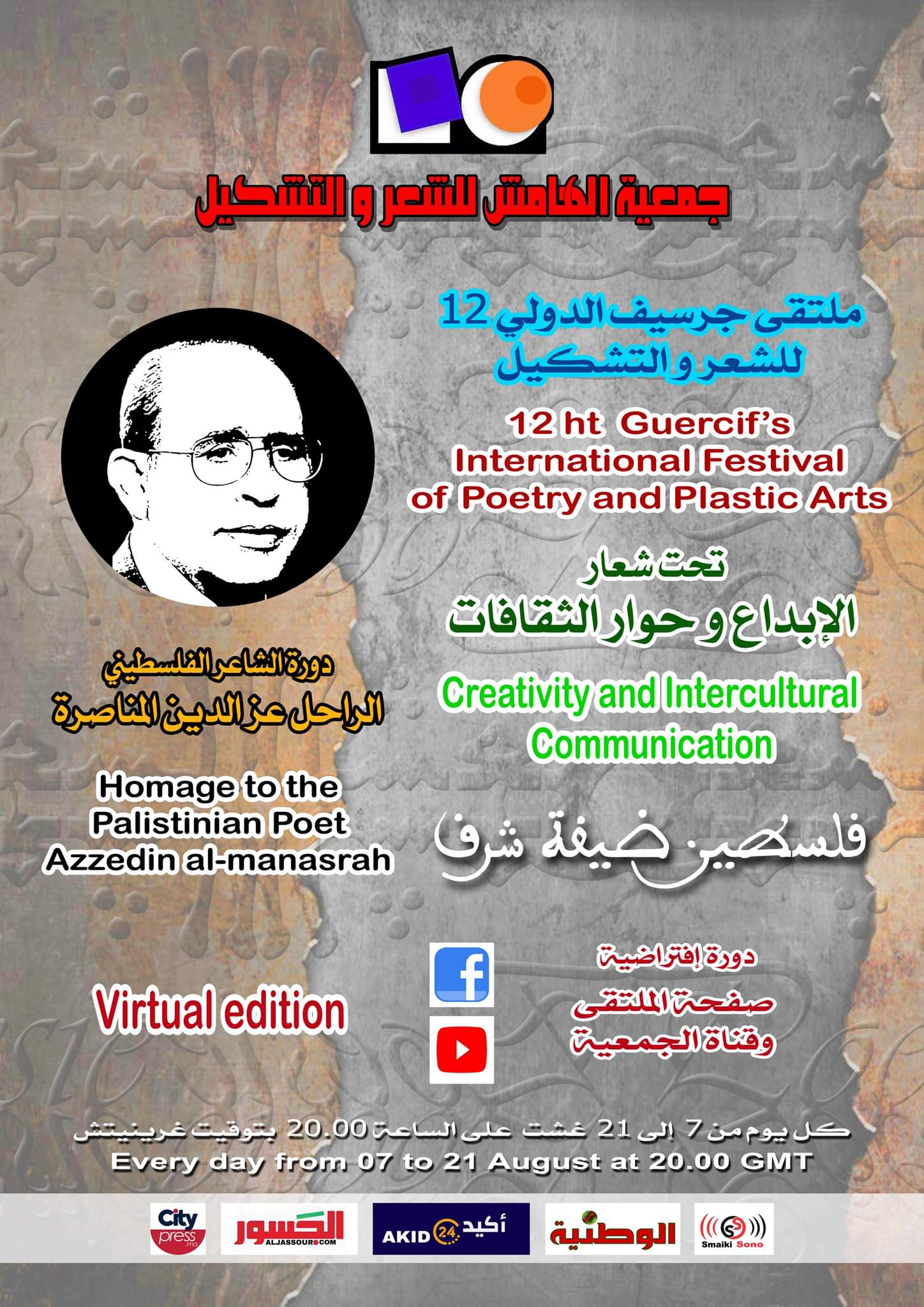 تعتزم جمعية الهامش للشعر والتشكيل، تنظيم الملتقى الدولي للشعر والتشكيل في دورته الثانية عشر، تحت شعار “الابداع وحوار الثقافات”، مهداة إلى الشاعر الفلسطيني الراحل عز الدين المناصرة، وذلك عبر العالم الإفتراضي ابتداء من يوم السبت 7 غشت الجاري وإلى غاية يوم 21 من نفس الشهر.