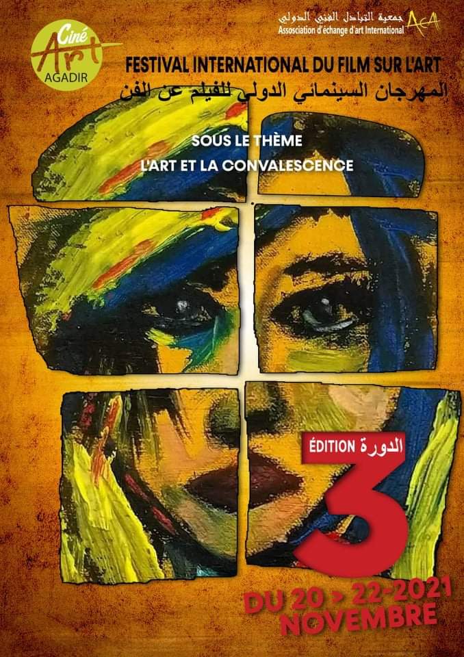 للمهرجان السينمائي الدولي للفيلم عن الفن” سيني ارت اكادير” على المنصة الرقمية الخاصة للمهرجان و على جميع منصات التواصل الاجتماعي ، وذلك خلال الفترة الممتدة ما بين 20 و 22 نونبر 2021 تحت شعار ” الفن والنقاهة”.