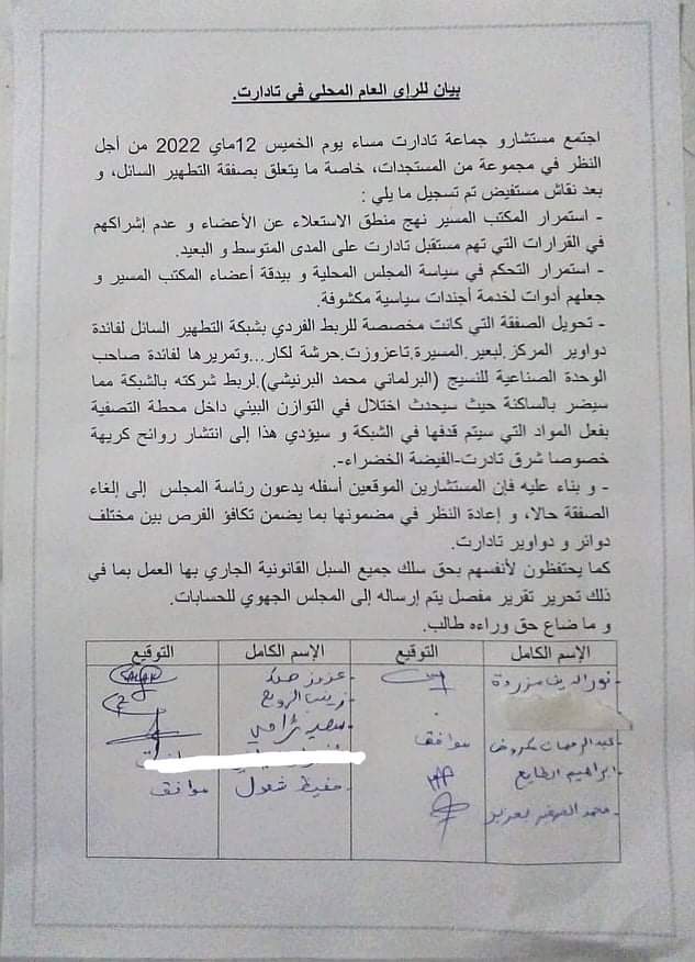 وطالب المستشارون الذين أصدرو البيان، والذين ينتمون، لكل من حزب التجمع الوطني للأحرار، الإتحاد الإشتراكي للقوات الشعبية، والإستقلال، رئيس المجلس بإلغاء الصفقة السالفة الذكر، والتي تم تفويتها لصاحب شركة النسيج، على حساب مصلحة دواوير، المركز،المسيرة، والبعير، ثم تاعزوزت، فضلا عن حرشة لكار، والتي من المنتظر أن تستفيد من شبكة التطهير السائل.