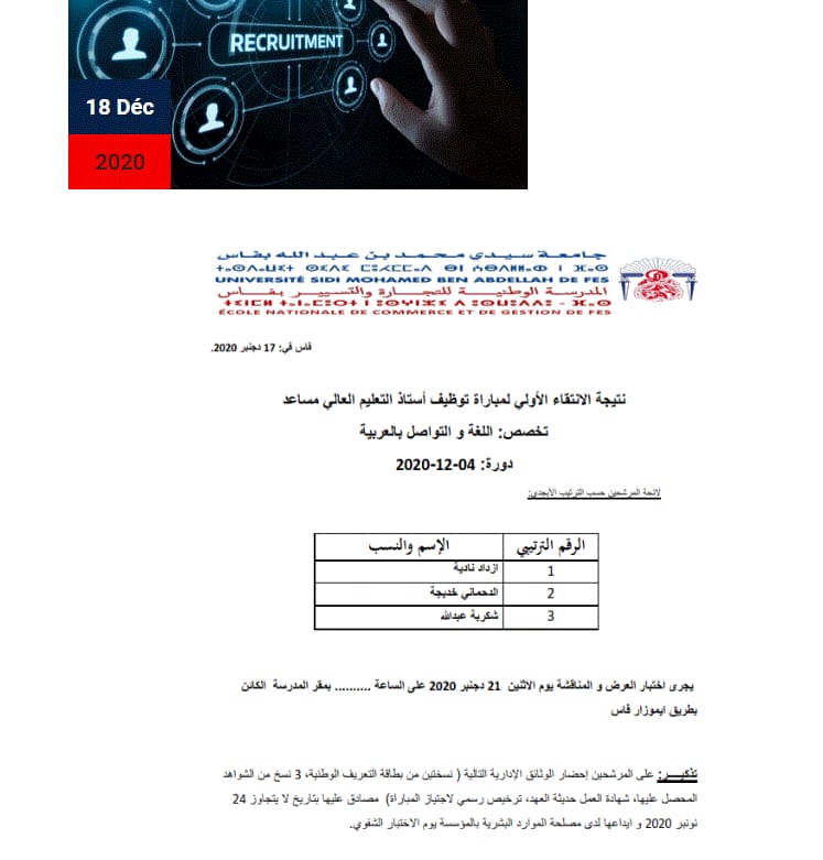 مثال ما تم تداوله بمباراة المدرسة الوطنية للتجارة والتسيير في فاس. دورة 04 دجنبر 2020 تم إعلان نتائج الانتقاء الأولي، كما هو مبين بموقع المدرسة يوم الجمعة 18 دجنبر السبت والأحد.. ليعلن عن المقابلة الشفوية يوم الإثنين ليتمكن من إنجاح السيدة “ن.از” من توصية مؤطر المدير الع ع ر، في الدكتوراه السيد ط. ع ر. بحيث نادية ازداد الناجحة حاصلة على الإجازة في الانجليزية و هي كاتبة سابقة للأستاذ (ط). ومن المتبارين أساتذة بملف علمي وازن وأساتذة زائرين بالمدرسة بتجربة أكثر من خمس سنوات في تخصص العربية بالمدرسة موضوع طعن في رسالة موجهة إلى الوزارة.