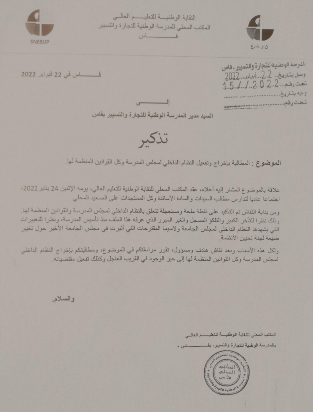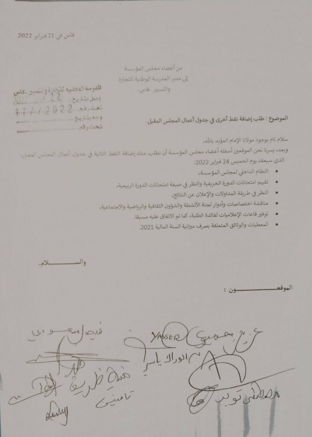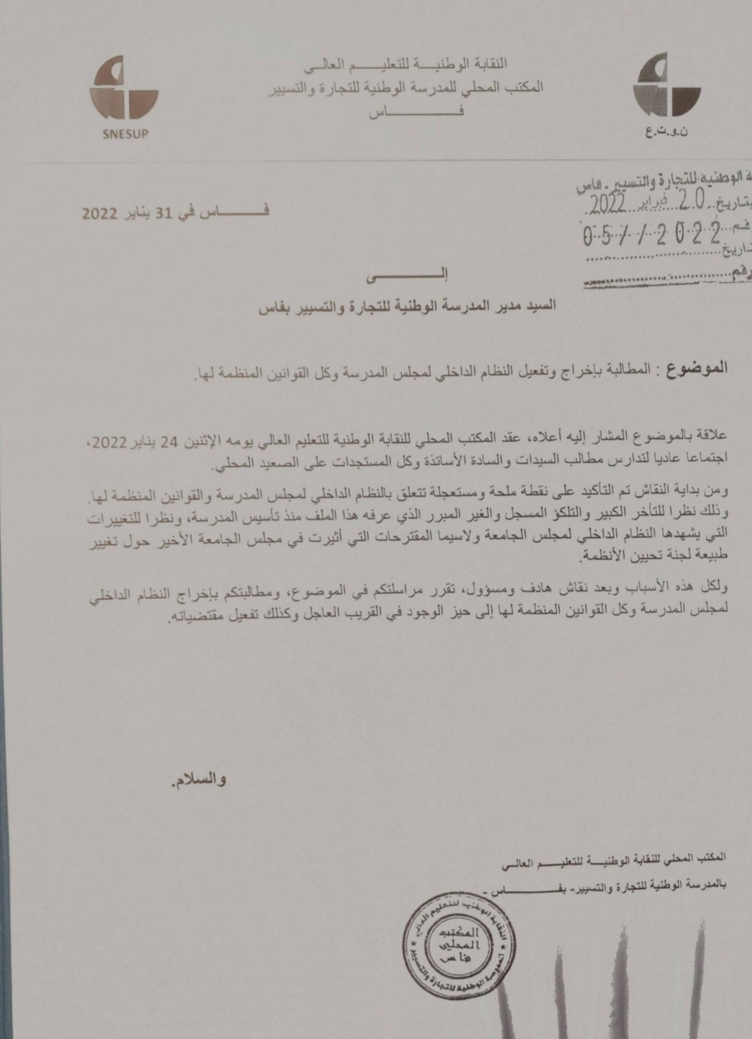 ( “سالة مفتوحة من الاعضاء “الغيورين عن المرفق العمومي”، مجلس المدرسة الوطنية للتجارة والتسيير بفاس.