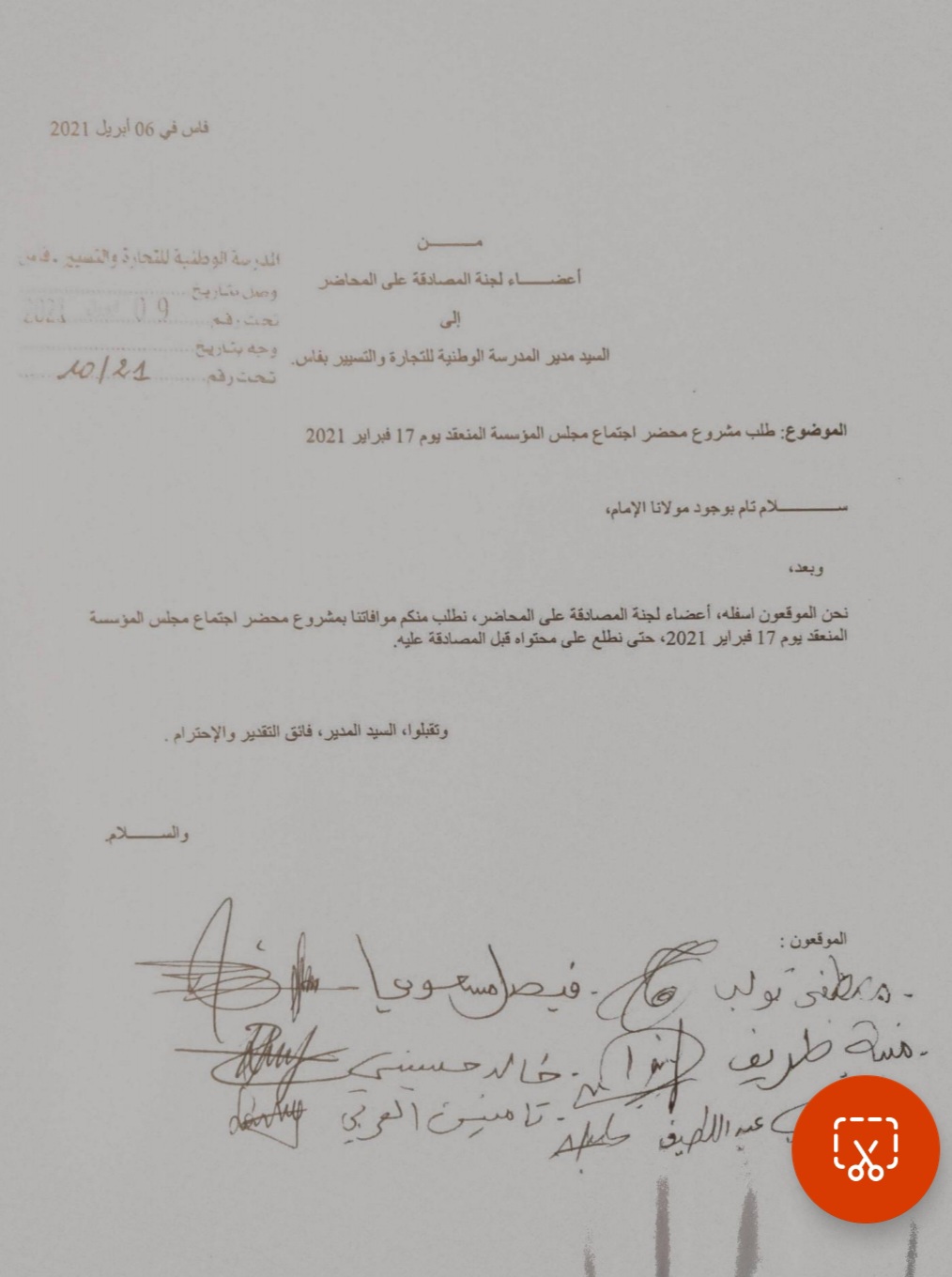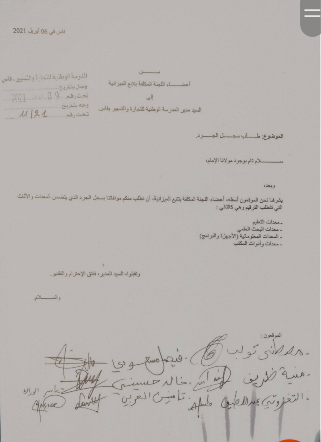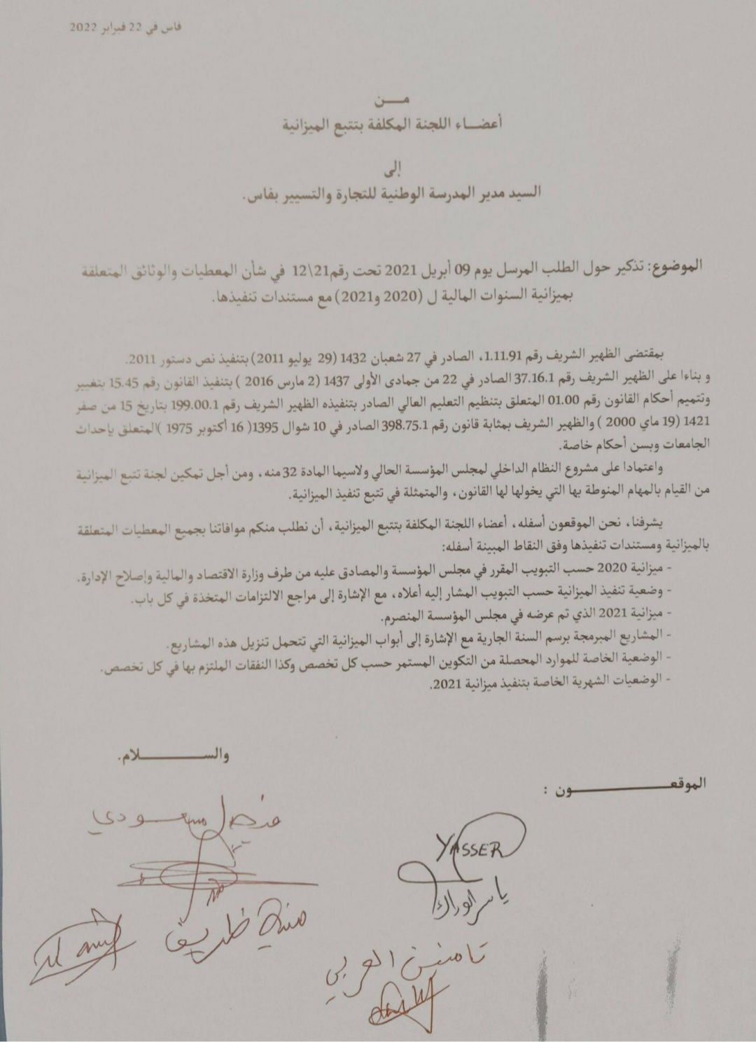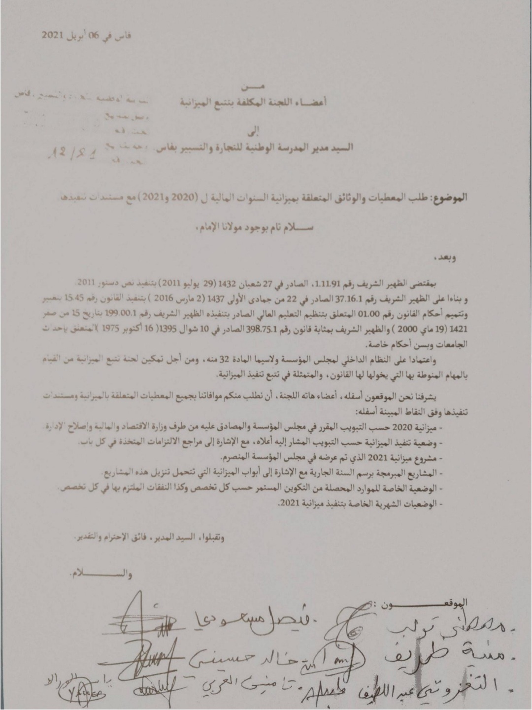 ( “سالة مفتوحة من الاعضاء “الغيورين عن المرفق العمومي”، مجلس المدرسة الوطنية للتجارة والتسيير بفاس.