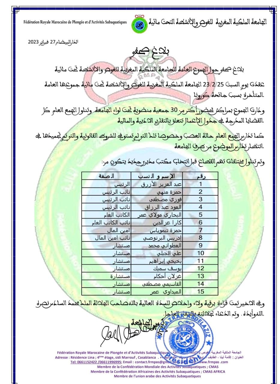 عقدت الجامعة الملكية المغربية للغوص والأنشطة تحت مائية يوم السبت 25 فبراير الجاري، بمدينة مراكش، جموعها العامة المتأخرة بسبب جائحة كورونا، حيث جرى انتخاب عبد العزيز الأزرق رئيسا لمكتبها المديري، وكل من حمزة منهي، فوزي مصطفى، العود عبد الرزاق نوابا له، والبحاري مولاي عمر كاتبا عاما، وحمزة تيموياس امين للمال.
