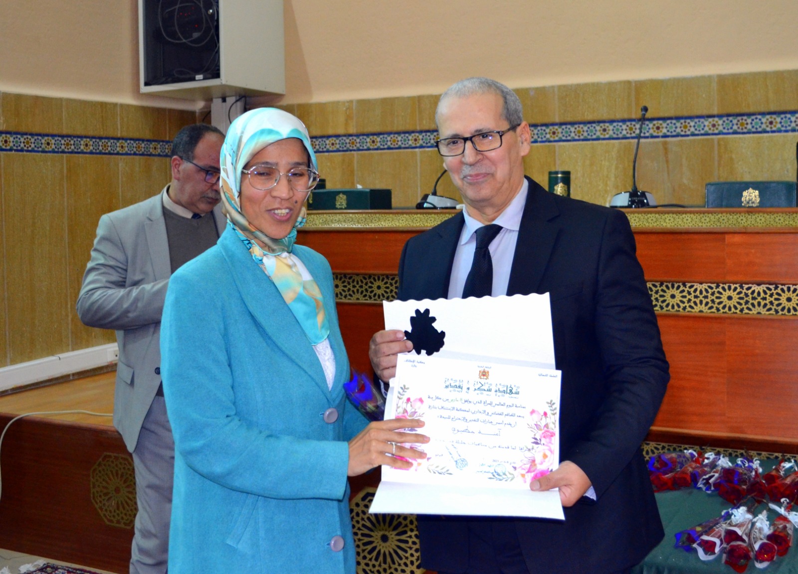 وفي الأخير تم توزيع الورود وهدايا رمزية على نساء العدل العاملات بالمحكمة، احتفاء بهن بهذه المناسبة، واعترافا لهن بمجهوداتهن في خدمة مرفق العدالة بدائرة تازة.
