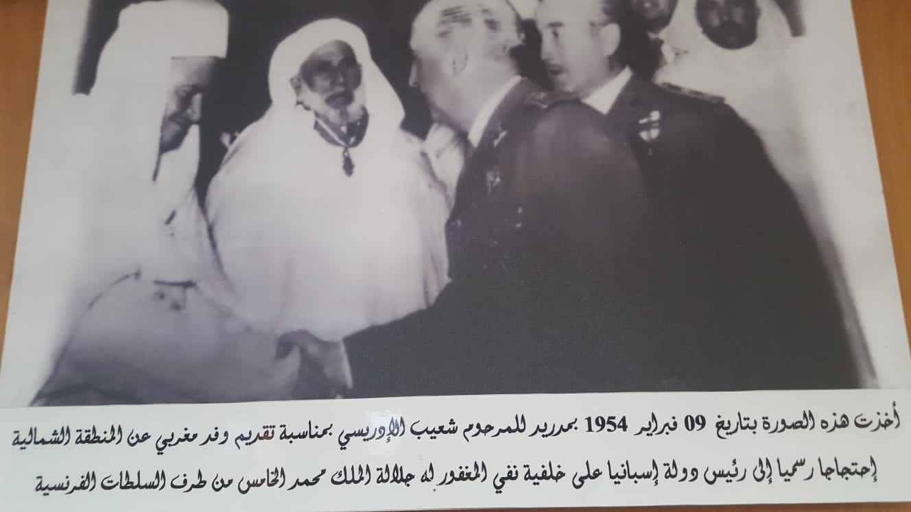 ويعتبر المرحوم شعيب الادريسي، من الشخصيات العشرة التي بصمت تاريخ المغرب، حيث كان من الشخصيات احتجت لدى الجنرال الاسباني فرانكوا على نفي جلالة الملك محمد الخامس من طرف السلطات الفرنسية آنذاك، ما خوله أن يتوشح بوسام الاعتزاز الملكي سنة 1954 من طرف خليفة السلطان بالمنطقة الشمالية مولاي الحسن بن المهدي كما وشحه جلالة المغفور له الملك الحسن الثاني بوسام العرش من درجة فارس.