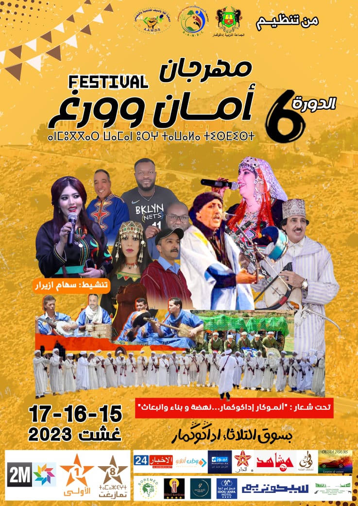تنطلق يوم الثلاثاء 15 غشت 2023 فعاليات مهرجان “أمان ؤورغ” بثلاثاء إداݣوݣمار (عمالة إقليم تيزنيت) في دورته السّادسة، الذي تنظّمه جمعية “أفلاّ واسيف” بتعاون مع جمعية “أݣرض نتسݣدلت”، بشراكة مع الجماعة الترابية لإداݣوݣمار، بحفل التّميز حيث سيتمّ تكريم المتفوّقين دراسيا من أبناء إداكوكمار برسم الموسم الدراسي 2023/2024، ستعقبها سهرة فنية ستنشطها كل من فرقتي “أحواش إداݣوݣمار”، و”أحواش تيمنكفين أنزي”، بمعية الفنّان الحسين أيت الفرح.