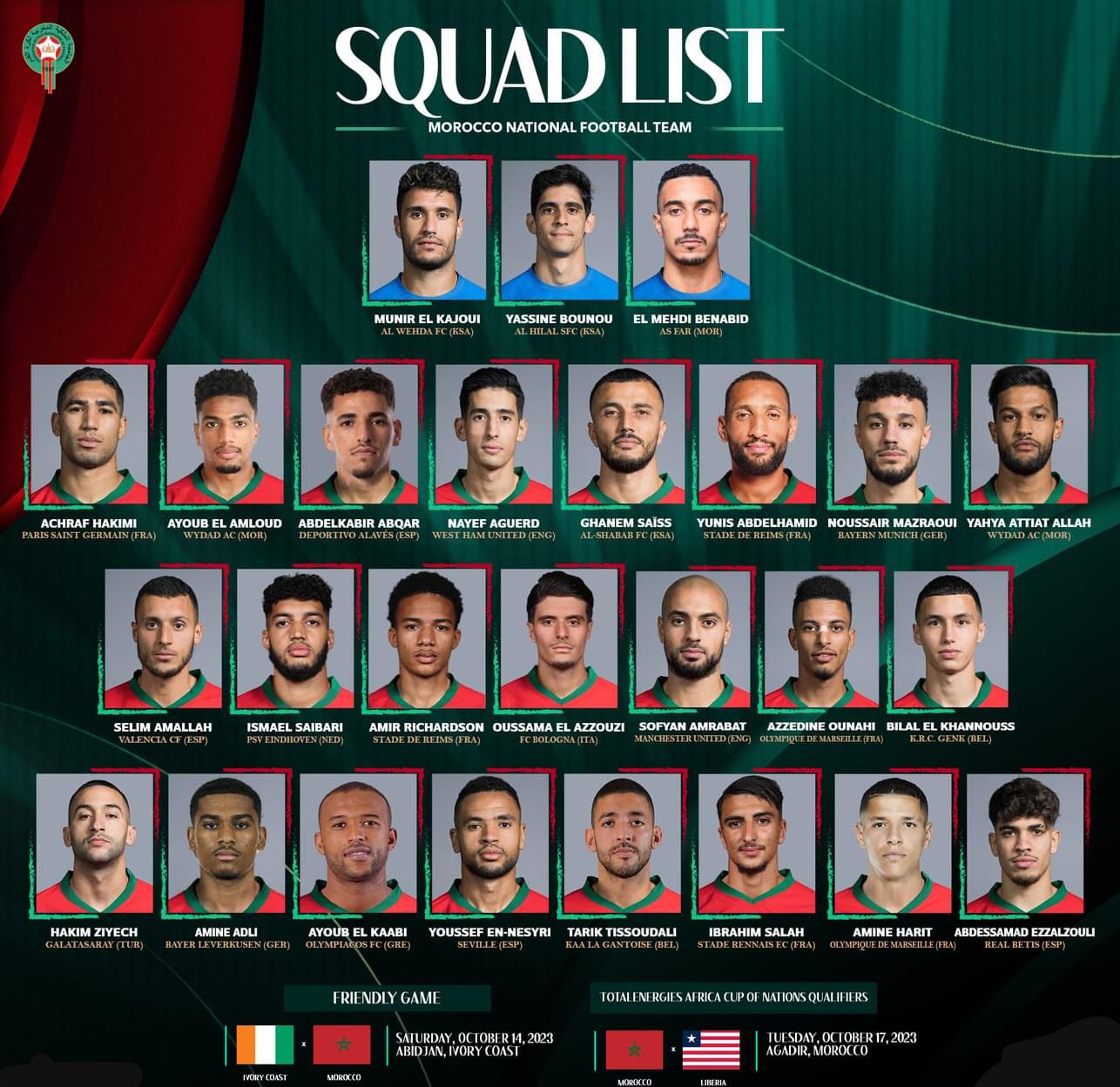 أعلن وليد الركراكي المدير الفني لمنتخب المغرب، قائمة تضم 26 لاعبا لخوض مباراتي كوت ديفوار وليبيريا خلال الشهر المقبل.
