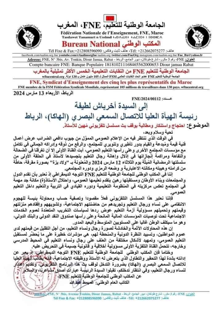 هذا وطالبت الجامعة الوطنية للتعليم، من خلال البيان الذي أصدرته، الهيئة العليا للاتصال السمعي البصري، بضرورة التدخل لوقف بث هذه السلسلة الرمضانية، وتقديم اعتذار لمربي أجيال الغذ.