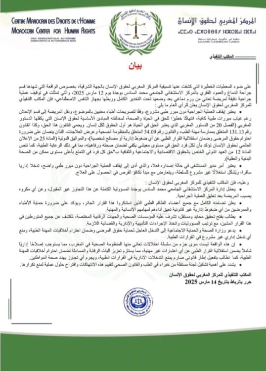 وفي سياق متصل، اعتبر المركز أن تدخل إدارة المستشفى، في حال ثبوت إصدارها أمرًا بوقف العملية دون مبرر طبي واضح، يشكل استغلالًا غير مشروع للسلطة وتدخلًا إداريًا سافرًا يتنافى مع مبدأ تكافؤ الفرص في الحصول على العلاج. وبناءً على ذلك، حمّل المكتب التنفيذي للمركز المغربي لحقوق الإنسان إدارة المستشفى المسؤولية الكاملة عن هذا التجاوز، محذرًا من تداعياته المحتملة على صحة المريضة.