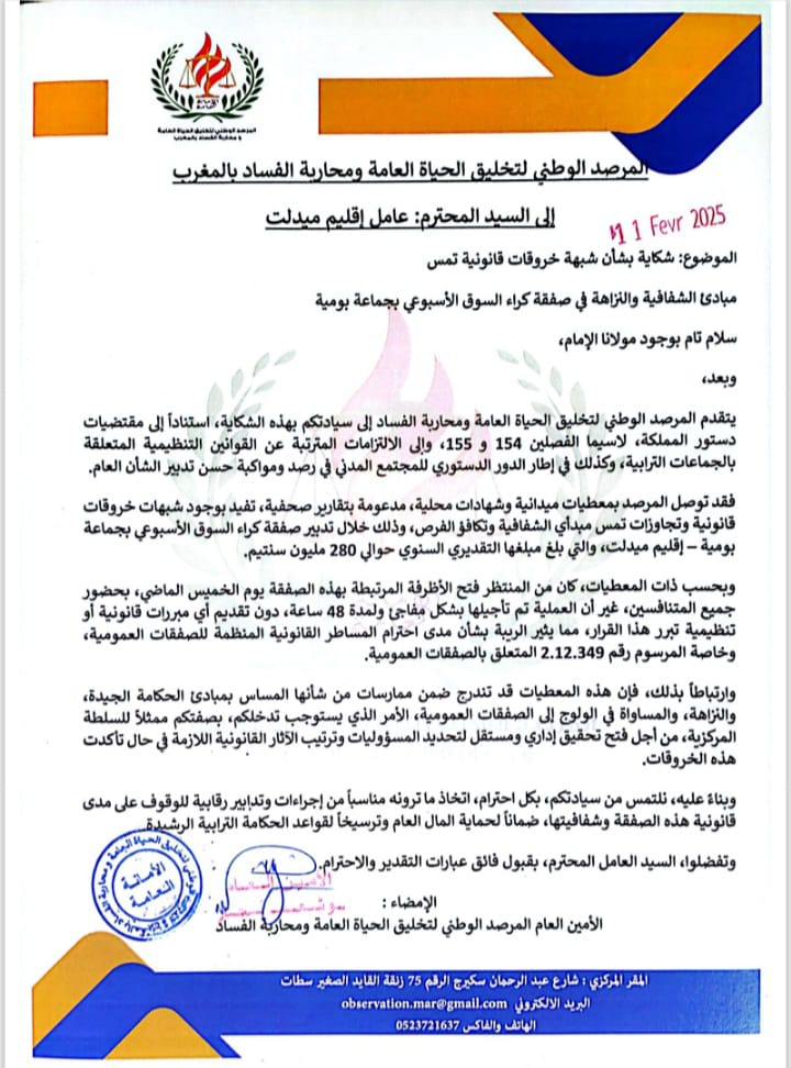 ميدلت.. المرصد الوطني لتخليق الحياة العامة يطالب بفتح تحقيق في شبهة خروقات في صفقة كراء السوق الأسبوعي بجماعة بومية