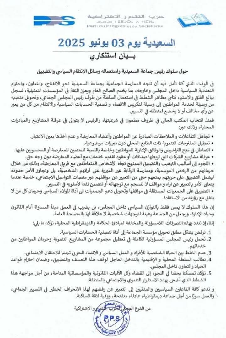 عبر الفرع المحلي لحزب التقدم والاشتراكية بالسعيدية، في بيان استنكاري صادر يوم 3 ماي 2025، عن قلقه العميق إزاء ما وصفه بتنامي مظاهر الشطط في استعمال السلطة من طرف رئيس المجلس الجماعي، معتبرا أن هذه الممارسات تمثل “انحرافا خطيرا في التسيير الجماعي”.