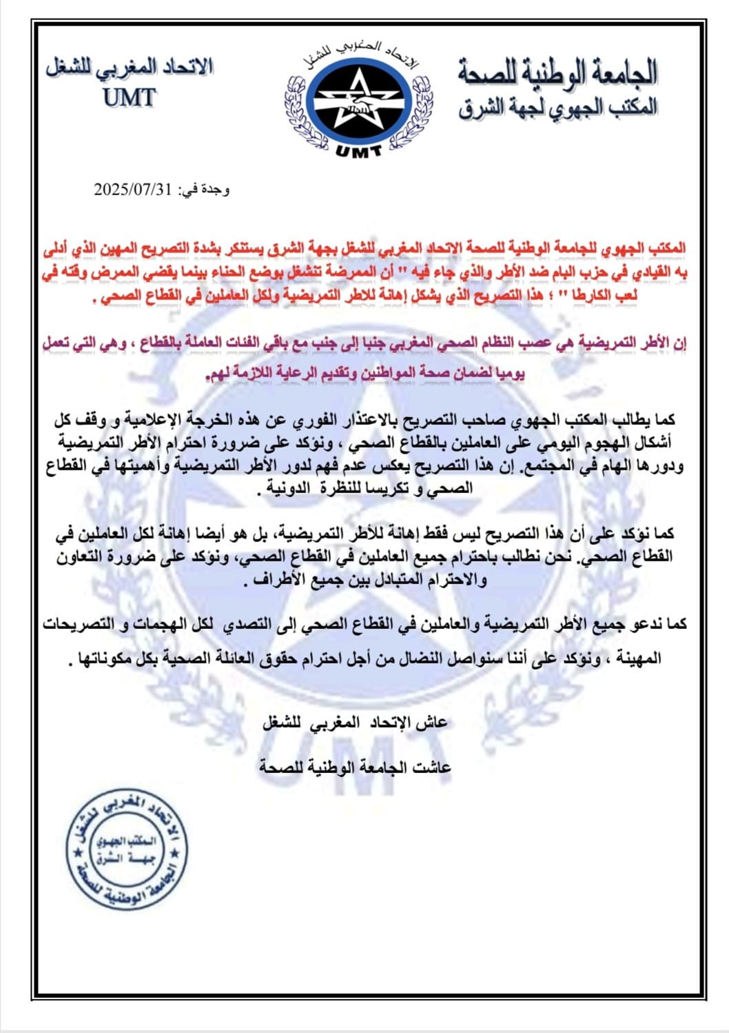 وطالب المكتب الجهوي صاحب التصريح بـتقديم اعتذار فوري وعلني، داعيًا إلى “وقف كل أشكال الهجوم المجاني والمتكرر على المهنيين الصحيين”، مع التأكيد على ضرورة احترام دور الأطر التمريضية ومكانتها داخل المجتمع.