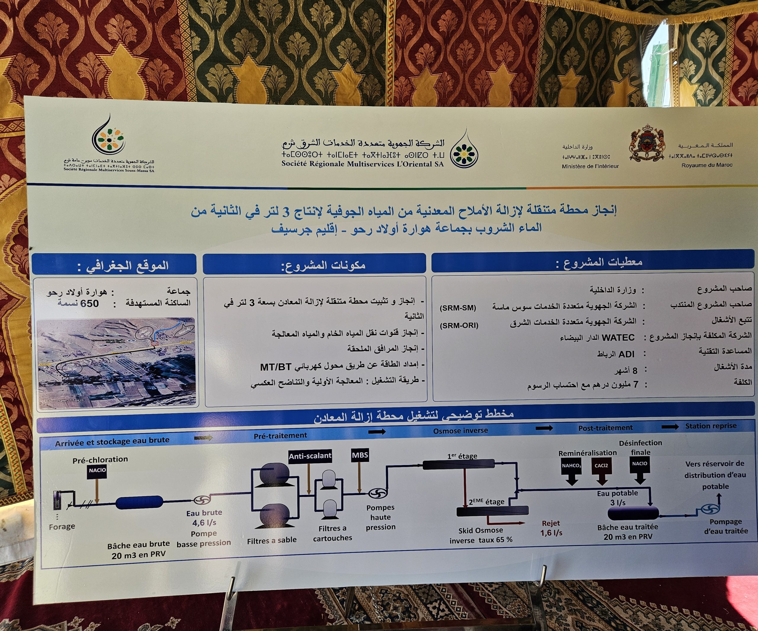 وتبلغ الطاقة الإنتاجية لهذه المحطة الجديدة 3 لترات في الثانية، بكلفة مالية تناهز 7 ملايين درهم، وستوفر الماء الصالح للشرب لفائدة حوالي 650 نسمة من ساكنة الجماعة، عبر معالجة المياه الجوفية المالحة باستعمال تقنية التناضح العكسي.