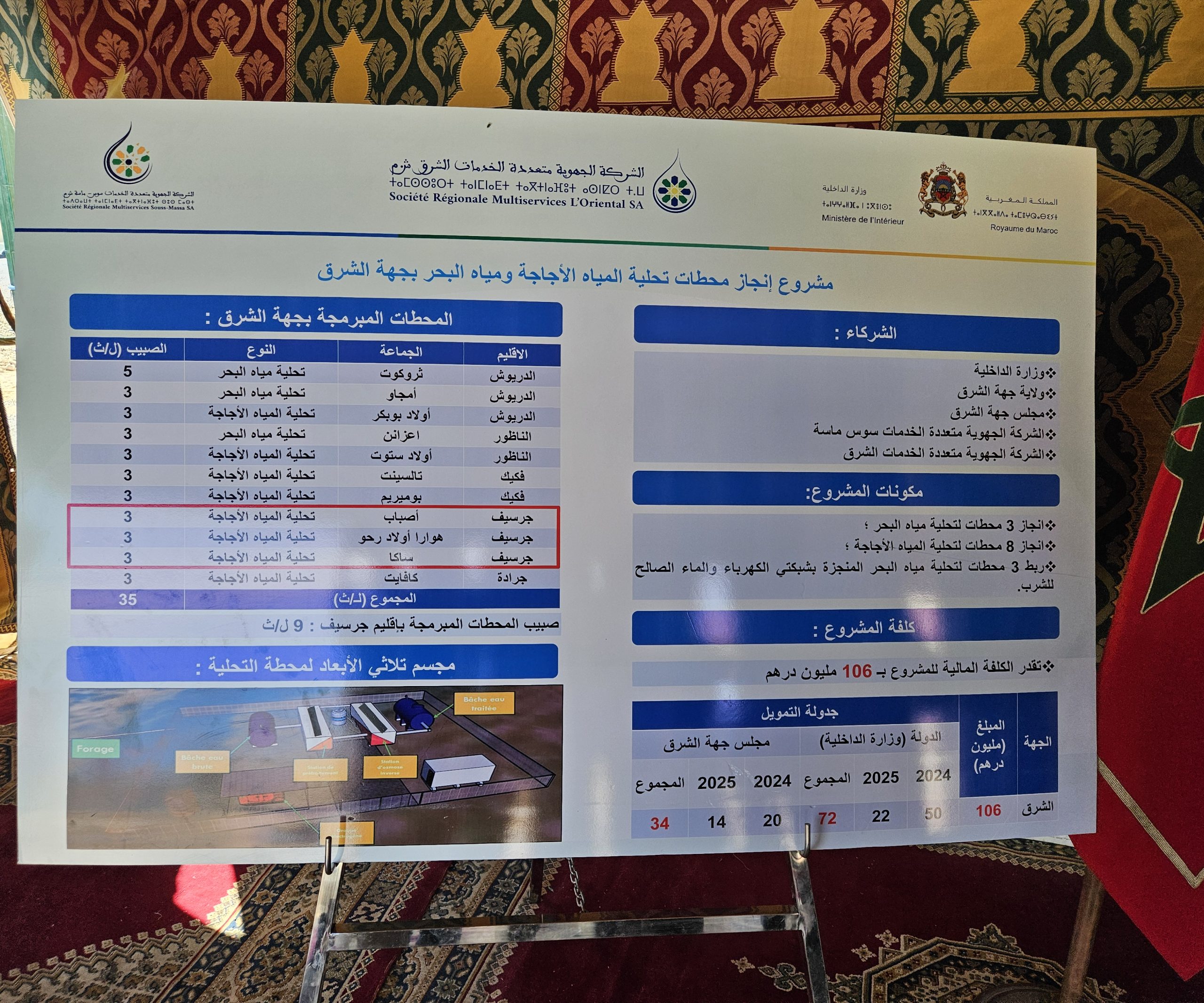 ويأتي إطلاق هذه المحطة في سياق مشروع جهوي واسع يهم إنجاز 11 محطة لتحلية المياه الأجاجة ومياه البحر بجهة الشرق، بكلفة مالية إجمالية تبلغ 106 ملايين درهم، وبطاقة إنتاجية إجمالية تصل إلى 35 لترا في الثانية.