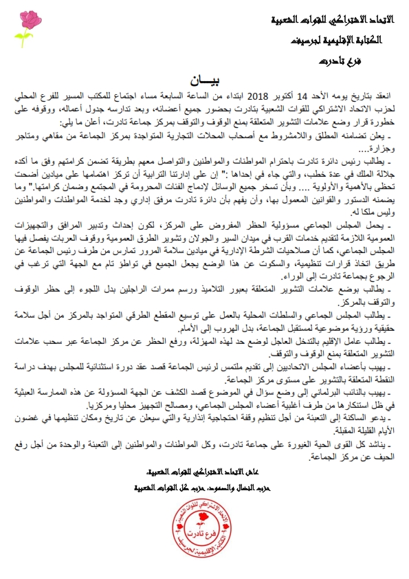 اصدر المكتب المسير للفرع المحلي لحزب الاتحاد الاشتراكي للقوات الشعبية بتادرت، يوم أمس الأحد 14 اكتوبر الجاري بيانا حول خطورة قرار وضع علامات التشوير المتعلقة بمنع الوقوف والتوقف بمركز جماعة تادرت، وأعلن فيه ما يلي: