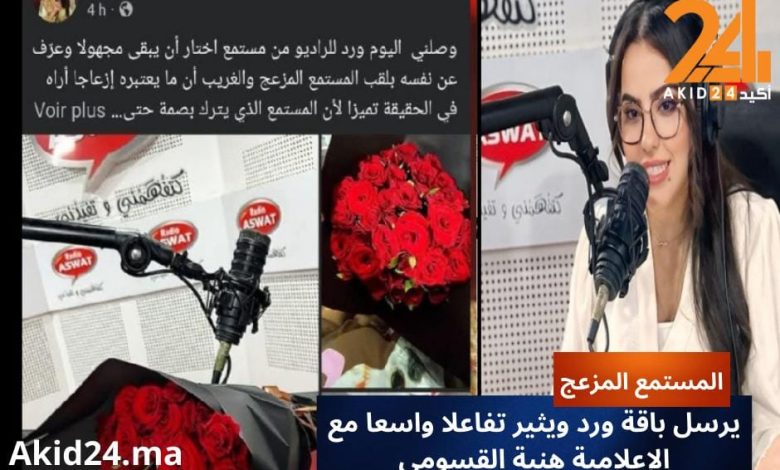 شهدت إذاعة “أصوات” يوم أمس موقفاً استثنائياً بعد وصول باقة ورد للإعلامية المغربية هنية القسومي، مرفقة ببطاقة من شخص اختار أن يعرّف نفسه بلقب “المستمع المزعج”، كتب فيها عبارة: “صوتك أجمل ما في الصباح، والأحمر هديتي لك.. مستمعك المزعج”.