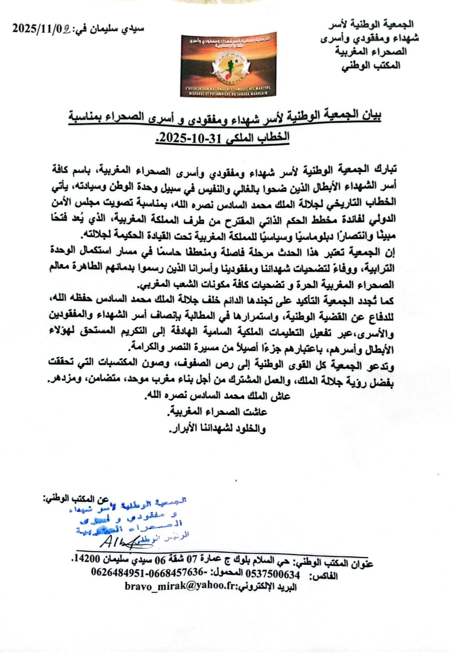 أصدرت الجمعية الوطنية لأسر شهداء ومفقودي وأسرى الصحراء المغربية بيانًا بمناسبة الخطاب الملكي السامي الذي ألقاه صاحب الجلالة الملك محمد السادس نصره الله، يوم الجمعة 31 أكتوبر 2025، عقب تصويت مجلس الأمن الدولي لصالح مخطط الحكم الذاتي الذي تقدمت به المملكة المغربية كحلٍّ جاد وواقعي لقضية الصحراء المغربية.
