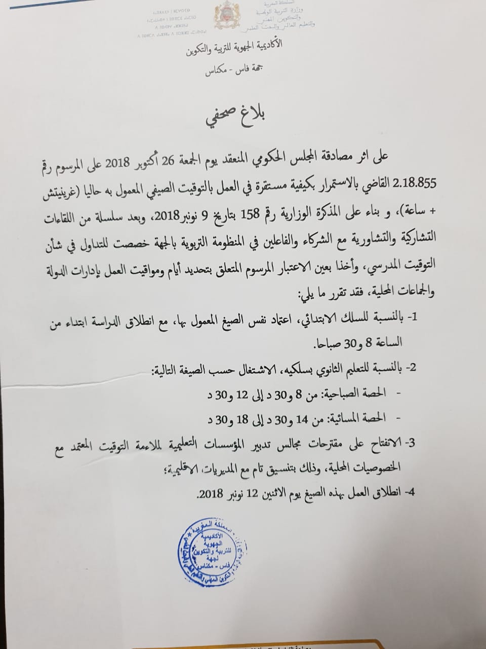 و يأتي هذا القرار حسب البلاغ ذاته بعد سلسلة من اللقاءات التشاركية و التشاورية مع الشركاء و الفاعلين في المنظومة التربوية بالجهة خصصت للتداول في شان التوقيت المدرسي و الأخدا بعين الاعتبارالمرسوم المتعلق بتحديد أيام و مواقيت العمل بإدارات الدولة و الجماعات المحلية على إثر مصادقة المجلس الحكومي المنعقد يوم الجمعة 26 أكتوبر 2018 القاضي على المرسوم بالاستمرار بكيفية مستقرة في العمل بالتوقيت الصيفي.