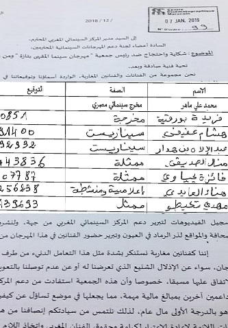 و ذكرت الشكاية التي توصل أكيد24 بنسخة منها أن بعض الفنانين انسحب للتو أو في اليوم الثاني من المهرجان مثل المخرجة ” فريدة بورقية ” والسيناريست ” هشام عفيفي “، لأنه يملك وسيلة نقل، وبقي الآخرون لأنهم لا يملكون وسيلة نقل. ولأنهم أخذوا عهدا من المسئولين عن المهرجان بتصحيح الوضع، لكن الوعودهم كانت مجرد كذب، و الهدف التقاط الصور وتسجيل الفيديوهات لتبرير دعم المركز السينمائي المغربي من جهة، ولنشرها وتوزيعها على الصحافة والمواقع لذر الرماد في العيون وتبرير حضور الفنانين في هذا المهرجان من جهة ثانية.