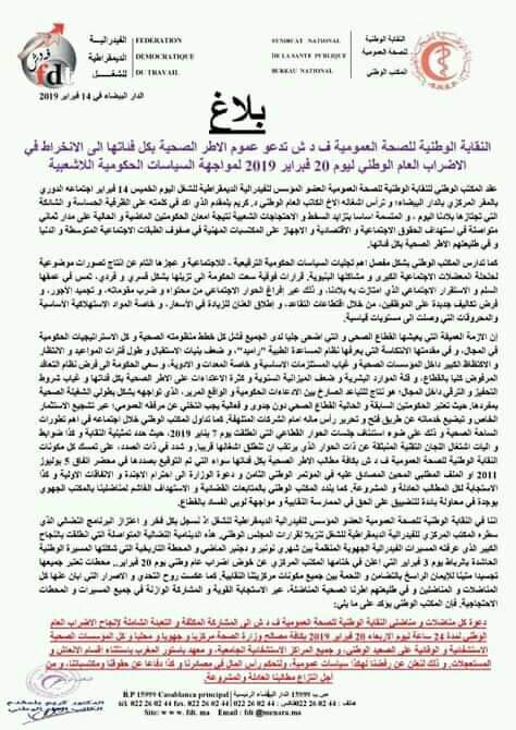 ﺩﻋﺖ ﺍﻟﻨﻘﺎﺑﺔ ﺍﻟﻮﻃﻨﻴﺔ ﻟﻠﺼﺤﺔ ﺍﻟﻌﻤﻮﻣﻴﺔ ﺍﻟﻤﻨﻀﻮﻳﺔ ﺗﺤﺖ ﻟﻮﺍء ﺍﻟﻔﺪﺭﺍﻟﻴﺔ ﺍﻟﺪﻳﻤﻘﺮﺍﻃﻴﺔ ﻟﻠﺸﻐﻞ ﻳﻮﻡ ﺍﻟﺨﻤﻴﺲ 14ﻓﺒﺮﺍﻳﺮ ﺍﻟﺠﺎﺭﻱ ﻣﻦ ﺍﻟﺪﺍﺭ ﺍﻟﺒﻴﻀﺎء، ﺟﻤﻴﻊ ﻣﻮﻇﻔﻲ ﻗﻄﺎﻉ ﺍﻟﺼﺤﺔ ﺍﻟﻌﻤﻮﻣﻴﺔ ﺇلى ﺧﻮﺽ ﺇﺿﺮﺍﺏ ﻭﻃﻨﻲ ﻋﺎﻡ ﻳﻮﻡ ﺍﻷﺭﺑﻌﺎء 20 ﻓﺒﺮﺍﻳﺮ ﺍﻟﺠﺎﺭﻱ، ﻣﻦ ﺃﺟﻞ ﺍﻟﺘﻌﺒﻴﺮﻋﻦ ﺭﻓﻀﻬﻢ ﻟﻠﺴﻴﺎﺳﺔ