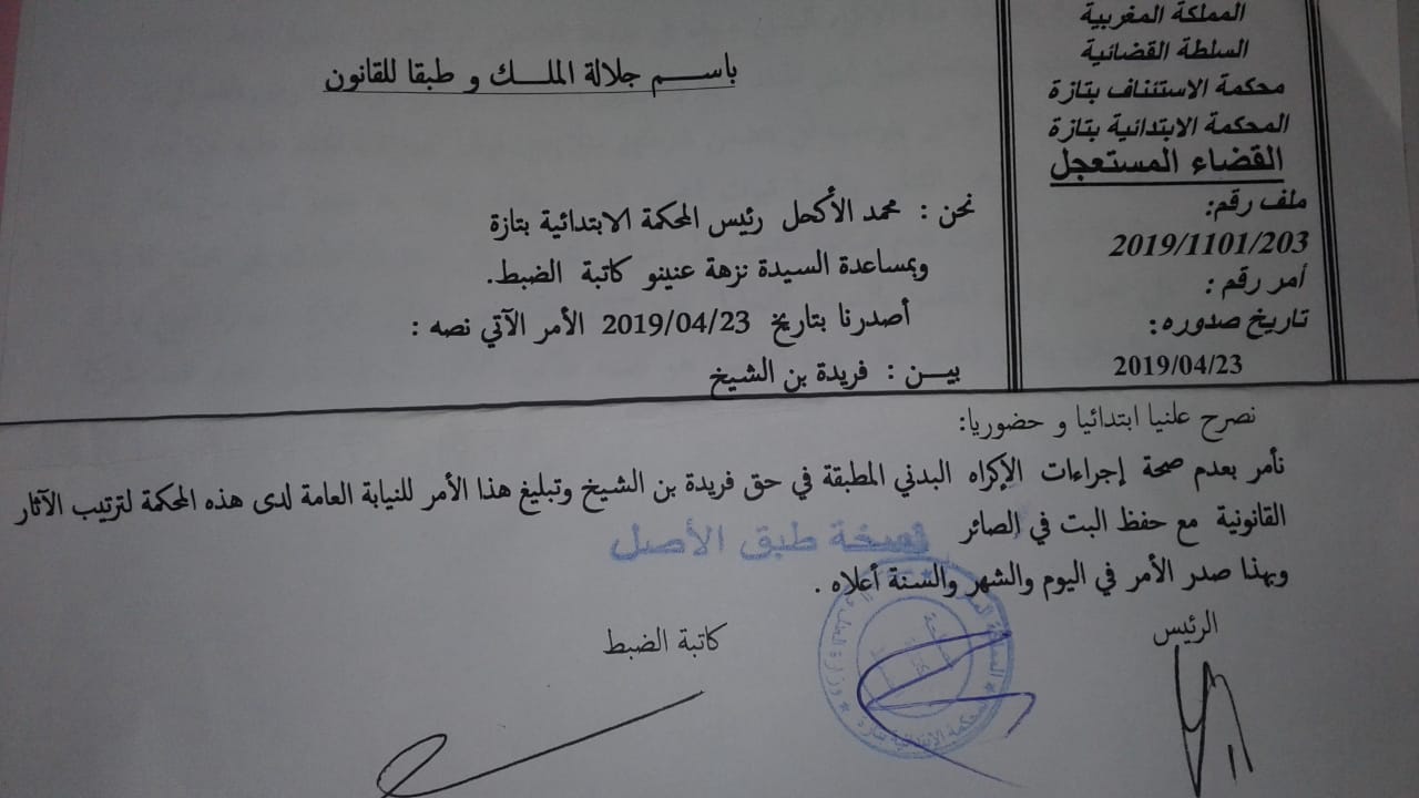 أصدر رئيس المحكمة الابتدائية بتازة بتاريخ 23أبريل 2019 أمره بعدم صحة إجراءات الإكراه البدني المطبقة في حق فريدة ابن الشيخ و تبليغ هذا الأمر للنيابة العامة لذى هذه المحكمة لترتيب الآثار القانونية بسبب حكم صدر في ملف عقاري.